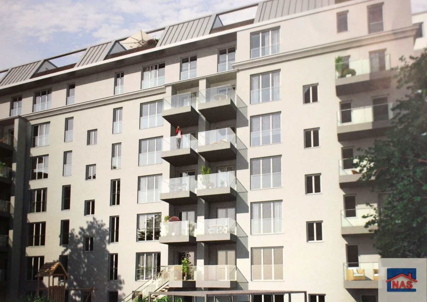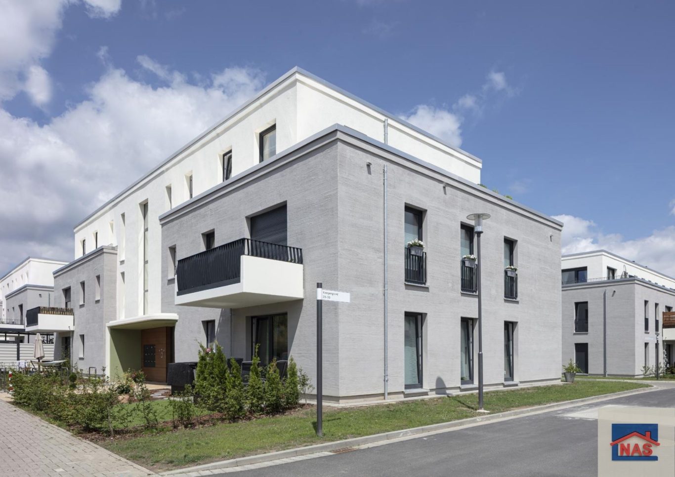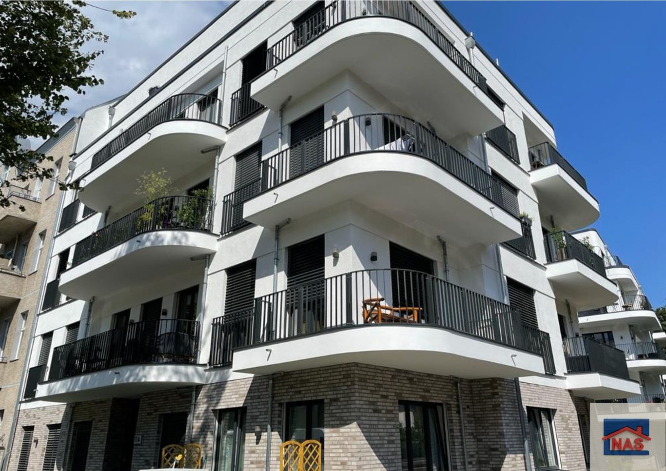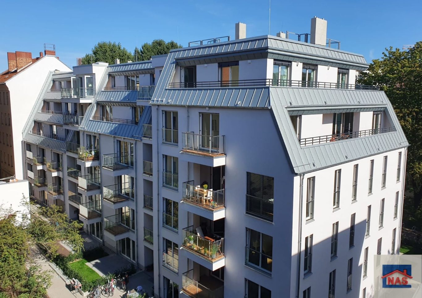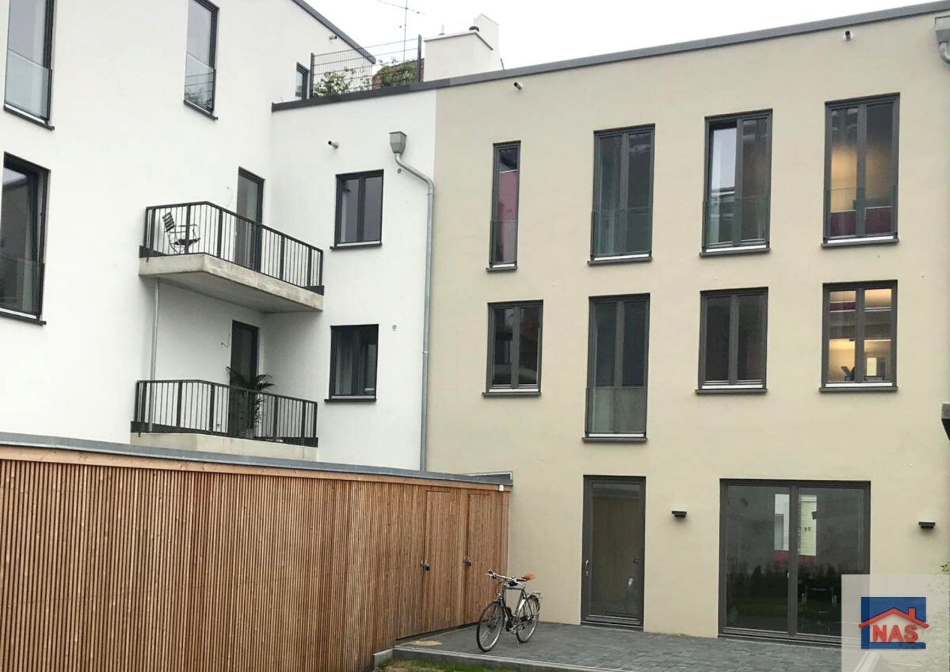 Die meisten Wohnungen verfügen über raumhohe Fenster sowie Balkone oder Loggien; im Dachgeschoss gibt es Terrassen. Im Untergeschoss befinden sich hofseitig Terrassen bzw. Gärten und straßenseitig Veranden.