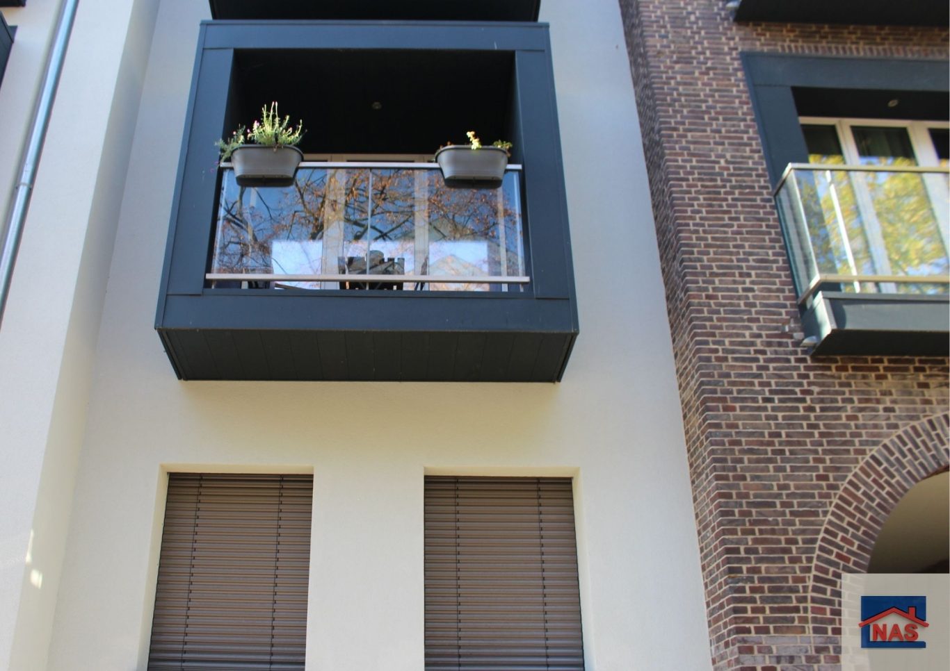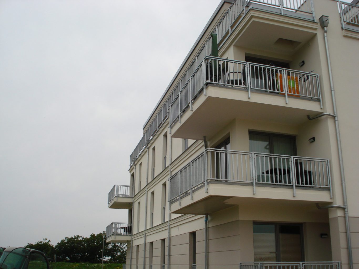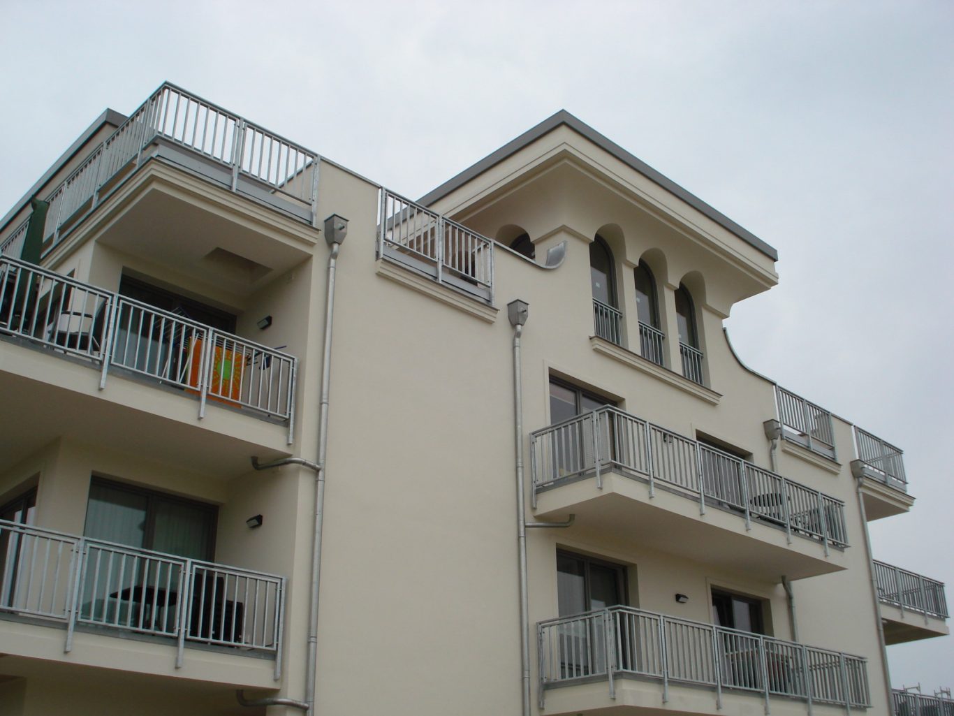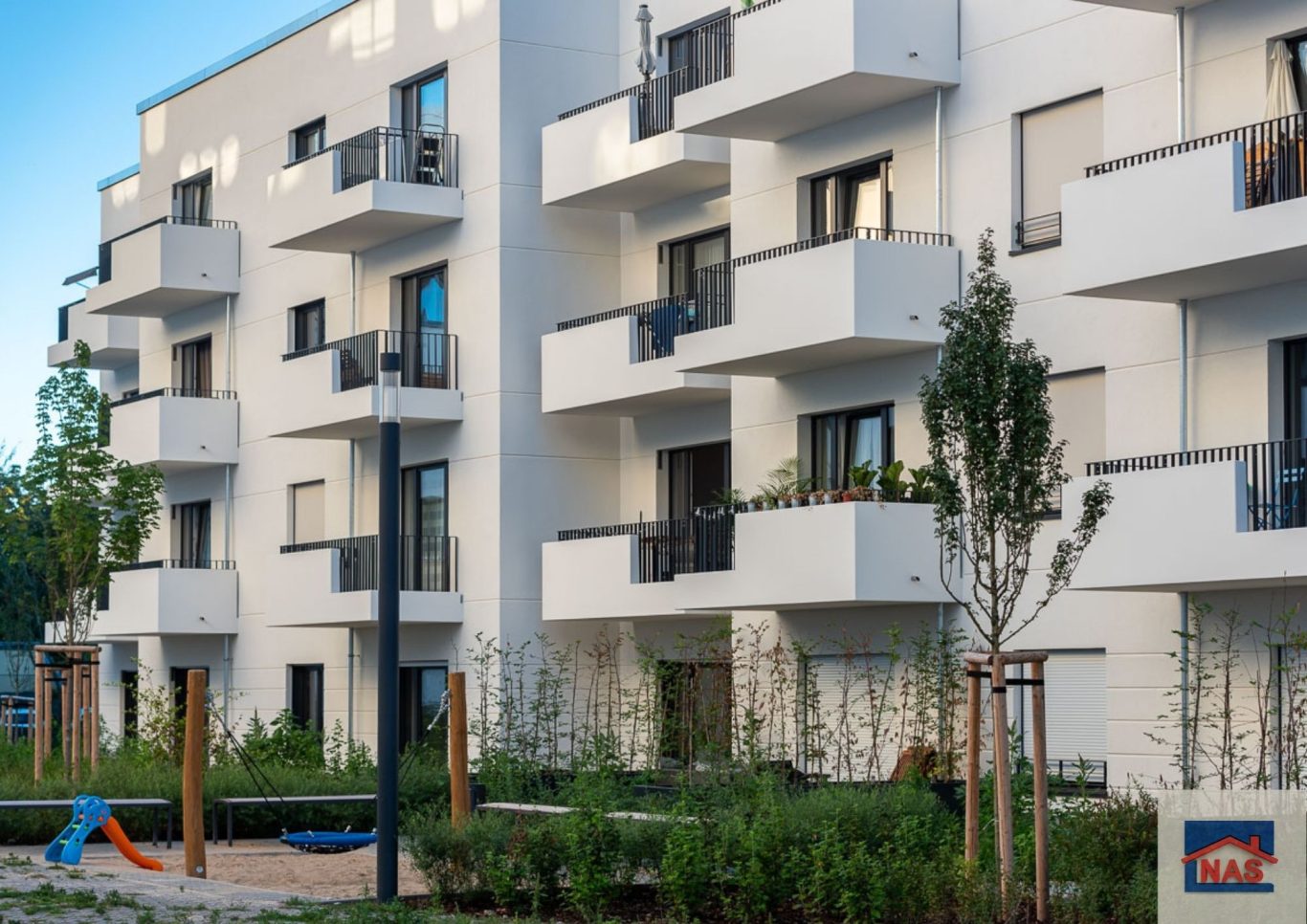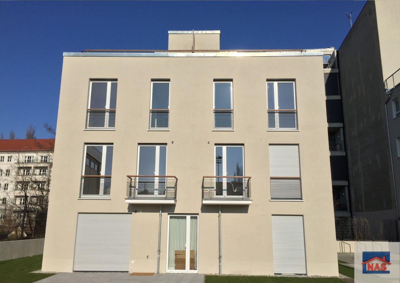 Die meisten Wohnungen verfügen über raumhohe Fenster sowie Balkone oder Loggien; im Dachgeschoss gibt es Terrassen. Im Untergeschoss befinden sich hofseitig Terrassen bzw. Gärten und straßenseitig Veranden.