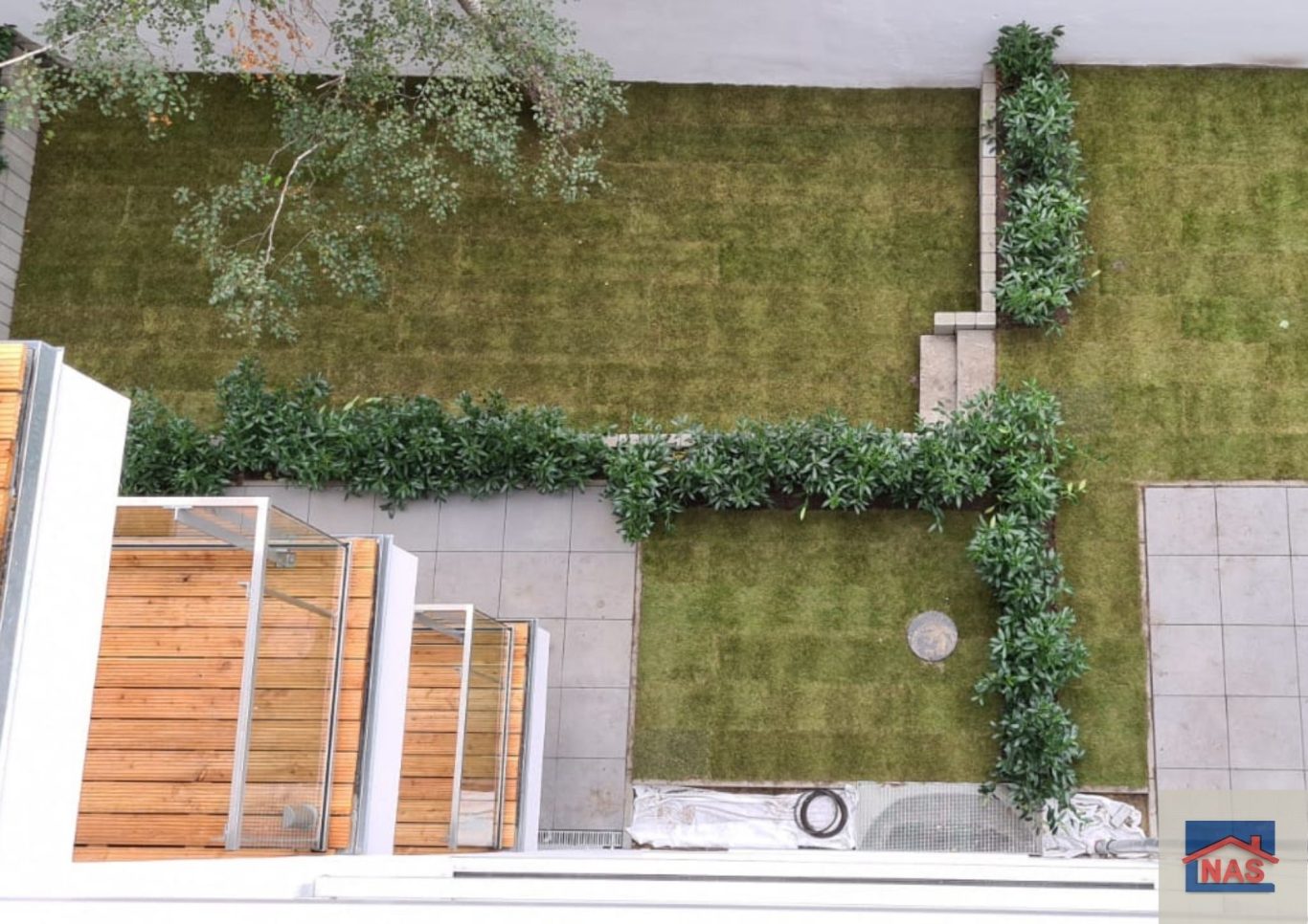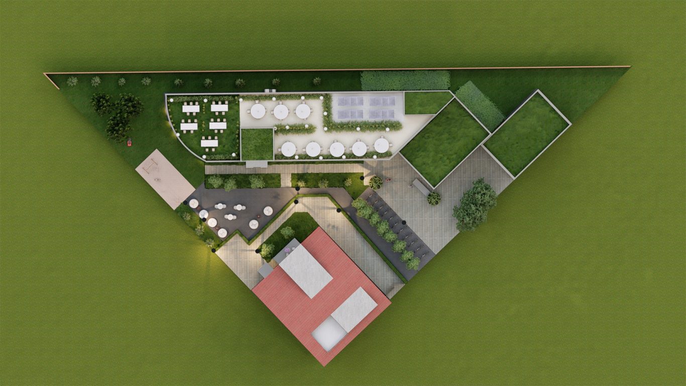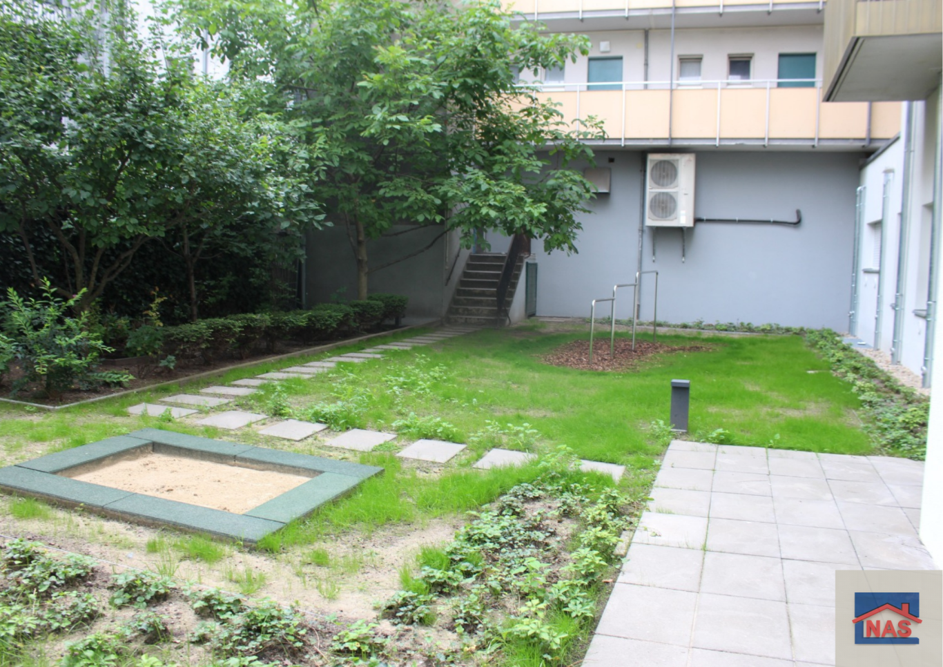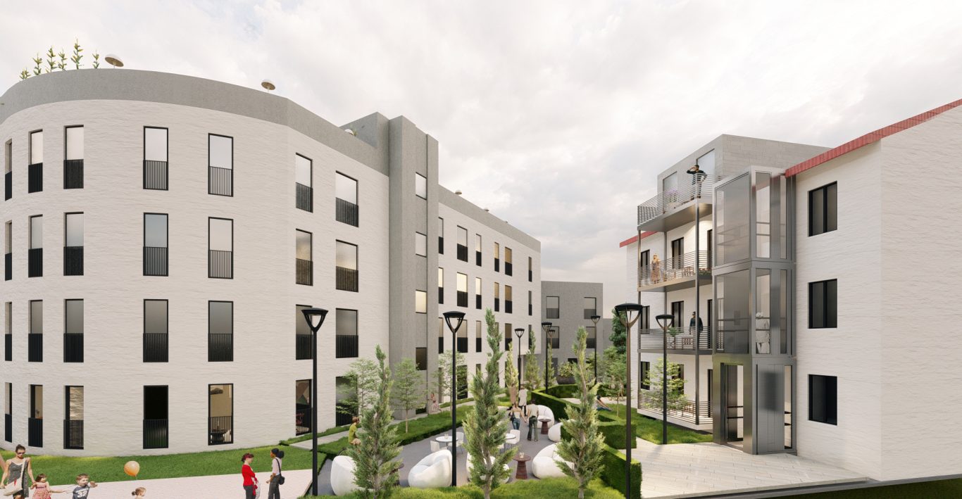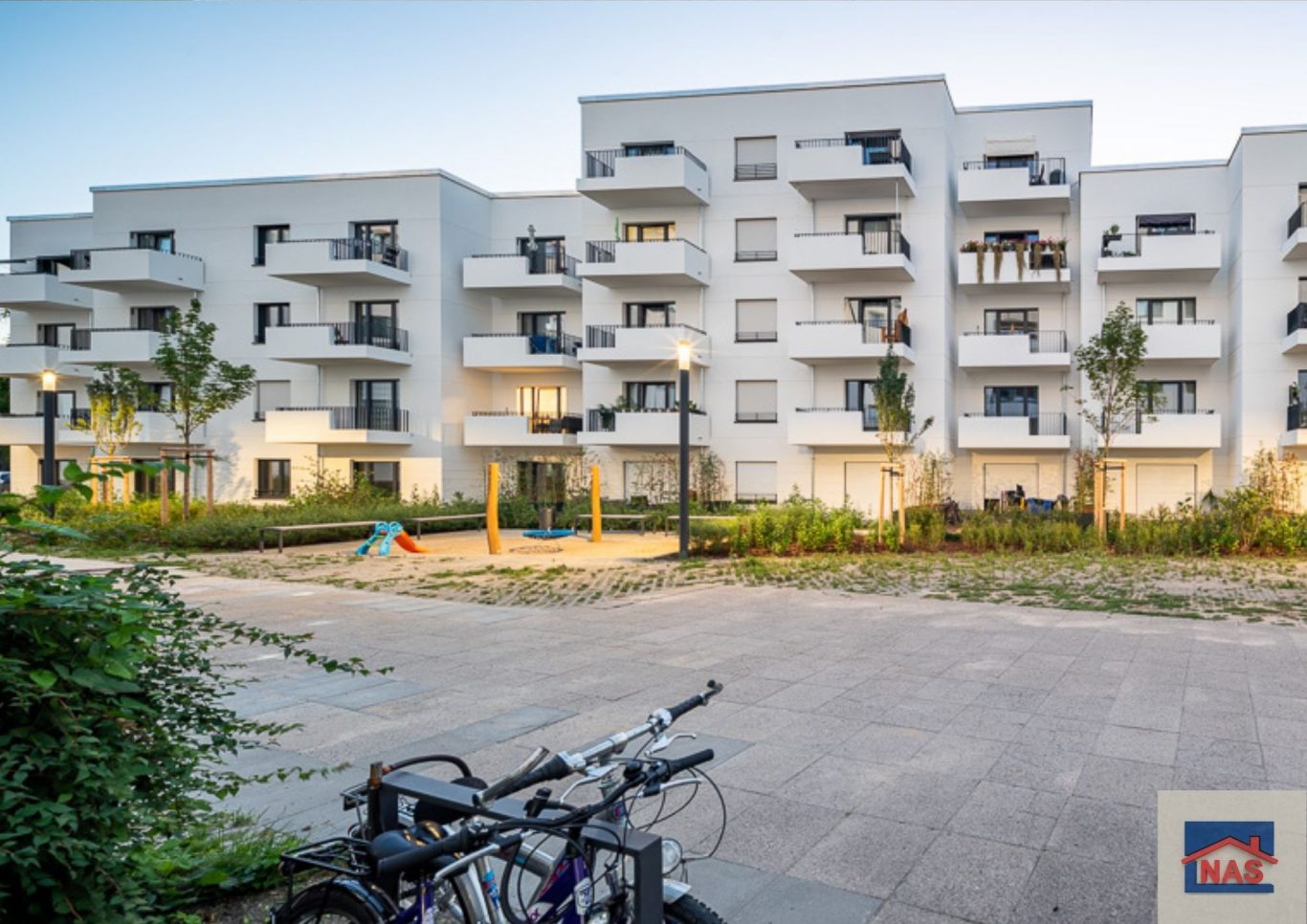 Das Kernstück der Außenanlagen ist der Gemeinschaftshof. Er dient als Begegnungsraum für die Bewohner der umliegenden Häuser. Es gibt zudem begrünte Spazierwege und Spielflächen mit Angeboten für alle Altersgruppen.