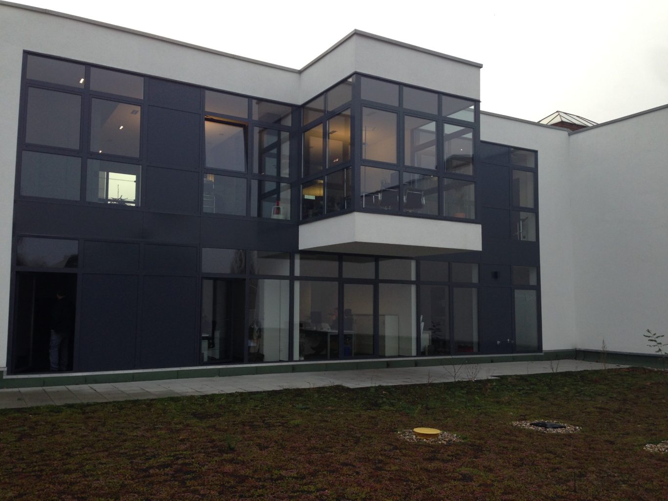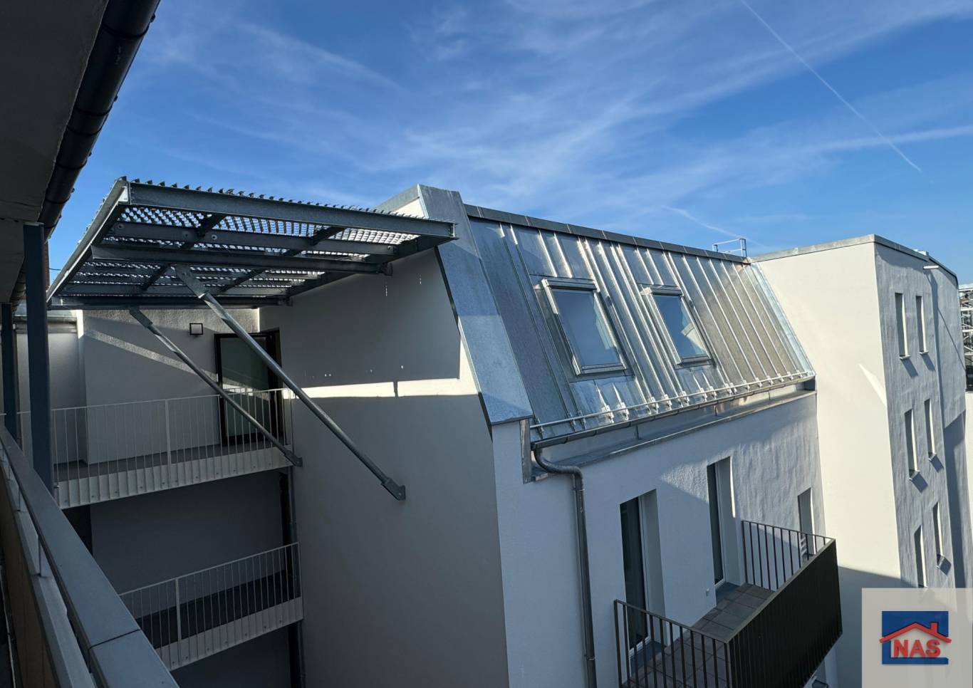 Das neue Penthouse entstand in Holzbauweise unter einem 60°-Mansarddach, ergänzt durch begrünte Flachdachbereiche. Die Fassade erhielt ein WDVS mit Dünnputz, und neue Vordächer wurden aus Stahl und Aluminium gefertigt.